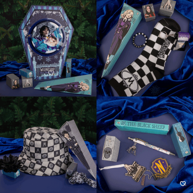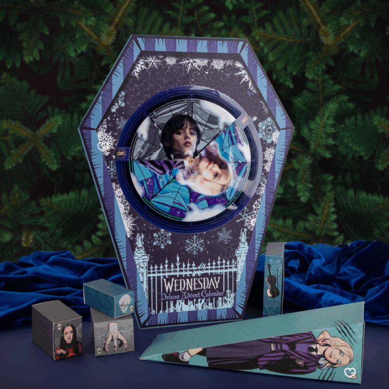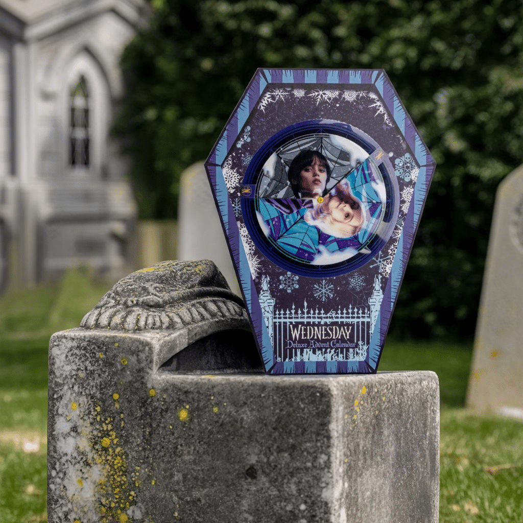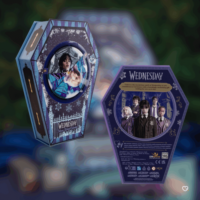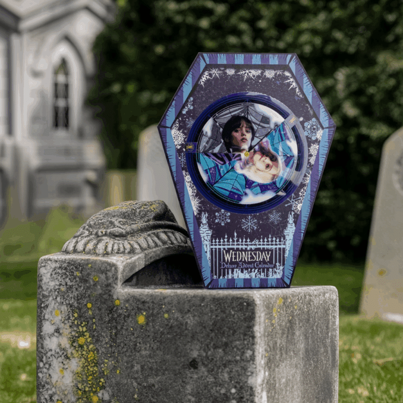 Présenté dans un somptueux coffret en forme de cercueil lenticulaire, ce calendrier dévoile chaque jour une surprise unique inspirée de l’univers fascinant de Wednesday Addams.