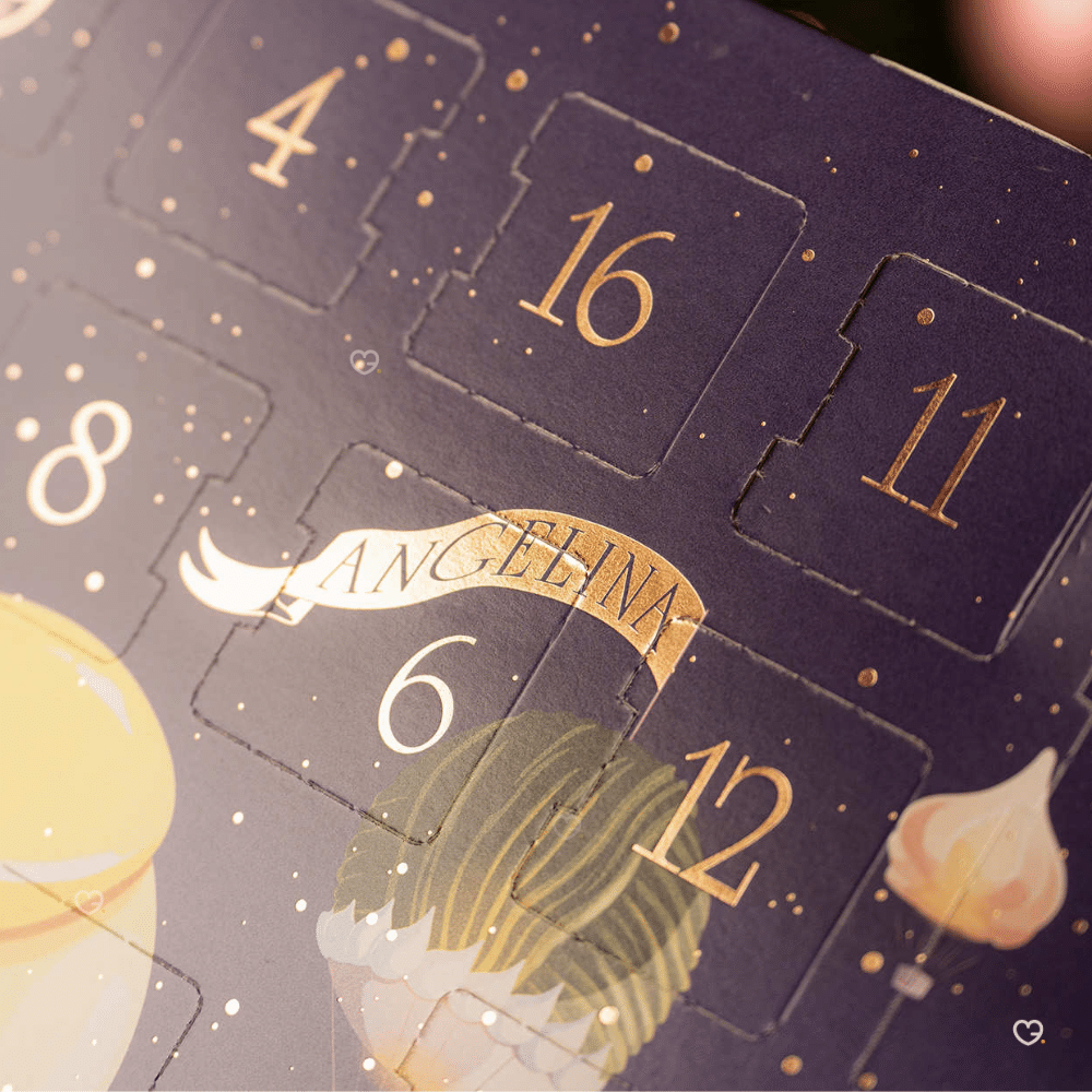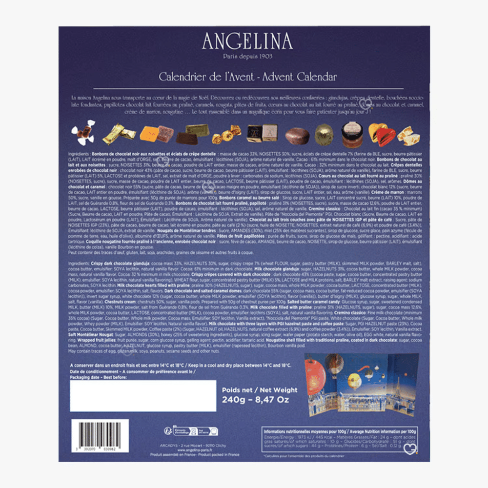 Parmi les 24 surprises, on retrouve des délices tels que la crème de marrons, les giandujas croustillants, les bonbons pralinés, les crêpes dentelles et le renommé thé Angelina.