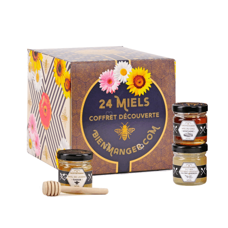 A l’intérieur, 24 pots de miels aux multiples saveurs originales et variées : Tilleul; Fleurs sauvages ou encore Châtaignier de Lozère et Thym ou encore chêne de France.