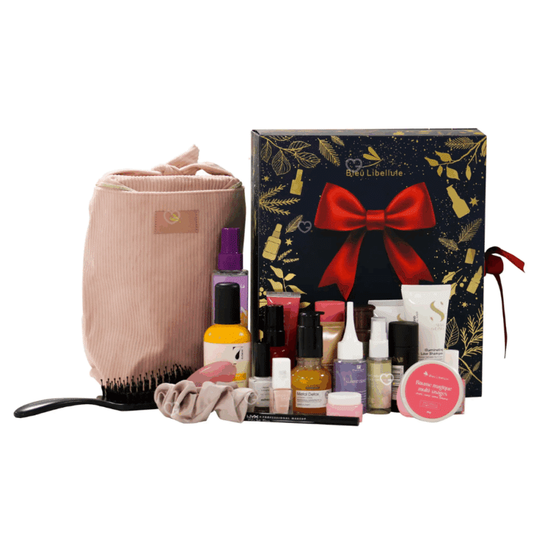 Le calendrier Bleu Libellulle contient 24 produits de beauté multimarque pour les soins capillaires, accessoires cheveux, maquillage, soins du visage ou encore produits pour les ongles . Le montant des produits (Démêlant; masque; accessoires; crème..) contenu dans ce coffret a une valeur de 240 euros