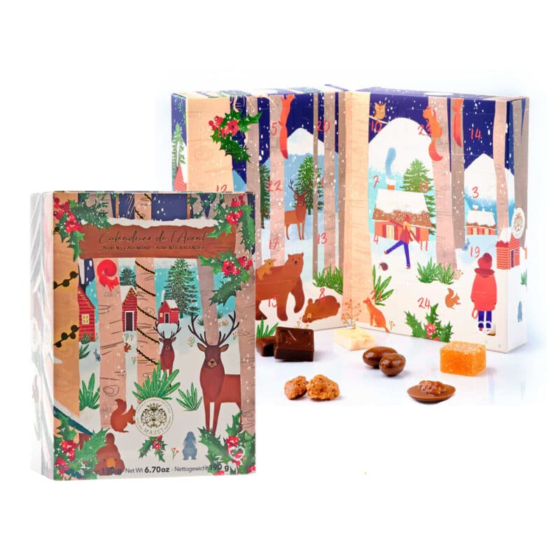 Animez et régalez vos papilles tout au long de la période de l’Avent avec ce délicieux calendrier de chocolat signé Mazet Confiseur ! À l’intérieur, découvrez 24 gourmandises raffinées dont 13 spécialités traditionnelles et 8 bonbons chocolatés : pralinés, ganaches, caramels et nougats.