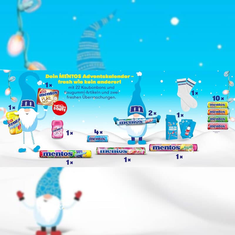 Le calendrier de l'Avent Mentos contient un assortiment varié de 24 friandises Mentos, avec des dragées à mâcher et des chewing-gums aux différents parfums. On y retrouve notamment :