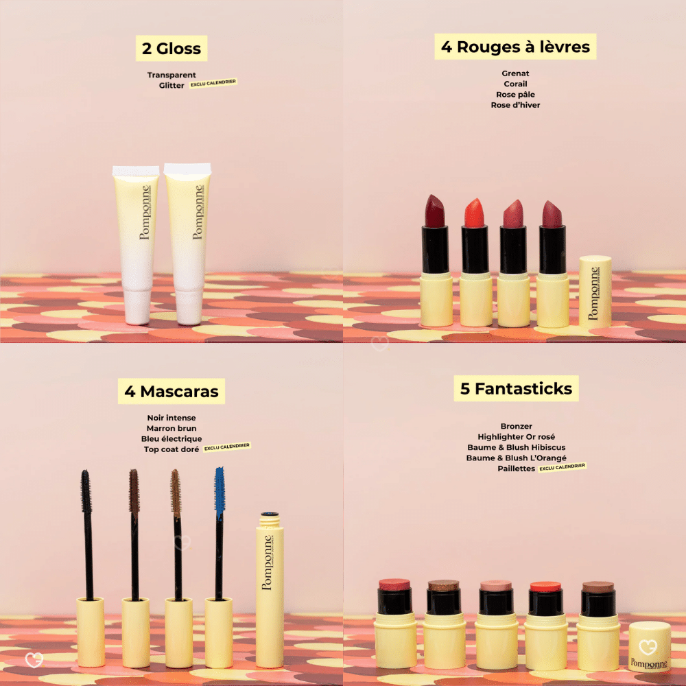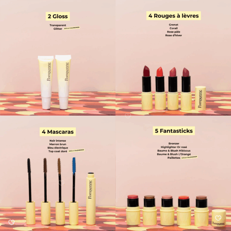 chaque jour un geste maquillage ou bien-être. Derrière ses 24 cases, la clean beauty dévoile toute sa créativité. Le calendrier de l'avent Pomponne met en lumière le savoir-faire d'une marque française vegan. Il transforme l'attente des fêtes en un rituel simple et joyeux. Grâce à ses produits en taille réelle et à ses accessoires pratiques, il apporte quotidiennement une touche de douceur et d'éclat. Une idée parfaite pour celles qui recherchent un calendrier de l'avent beauté 2025 élégant et respectueux.