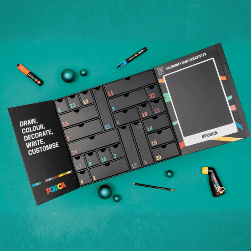 Le calendrier Posca contient 24 produits de papeterie et créativité. La valeur totale des produits contenus n'est pas communiquée.