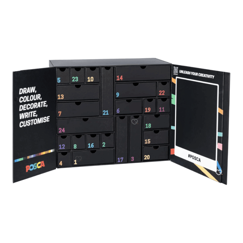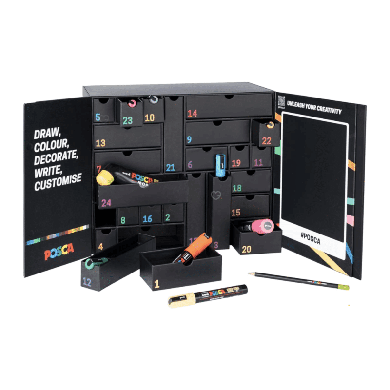 Tel un atelier créatif , le calendrier de l'Avent Posca vous propose de découvrir chaque jour des feutres peinture, des accessoires pratiques et supports originaux pour exprimer et créer vos plus belles œuvres (de Noël ou pas).