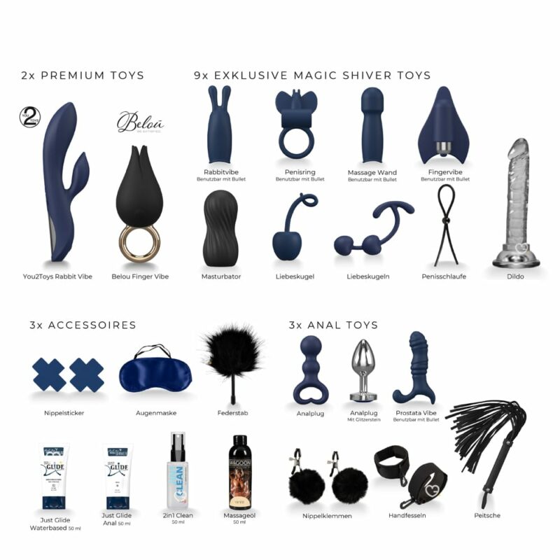 Un coffret sexy qui vous invite à frissonner de plaisir pendant 24 jours (« Feel The Magic Shiver ») avec des produits et accessoires conçut pour le plaisir des hommes et des femmes.