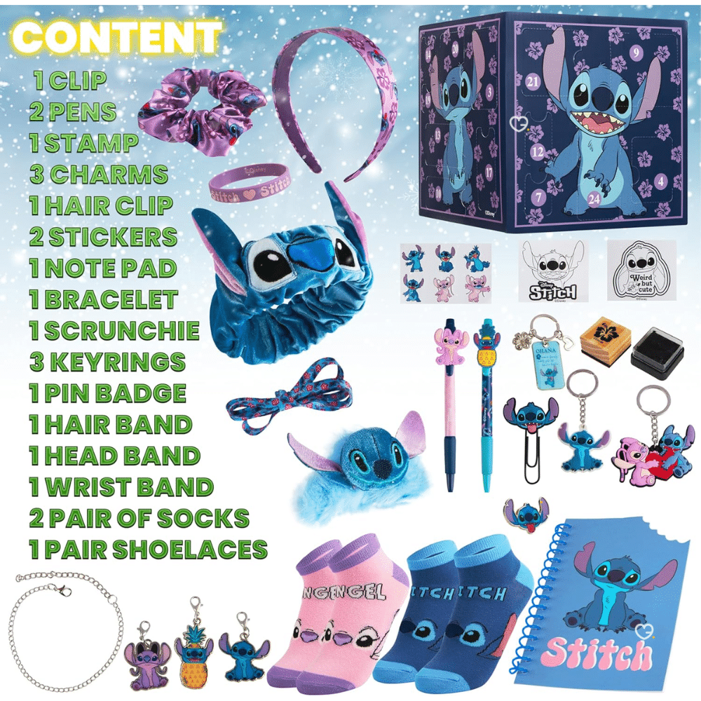 Pendant 24 jours, les petites filles pourront retrouver leur personnage préféré, le petit extraterrestre bleu, au travers de surprises inédites, pratiques, utiles et surtout amusantes : Stylo; chaussette; porte-clés; serre-tête. Le calendrier de l'avent Stitch prolonge la magie Disney jusqu'au Noël dans la bonne humeur aux couleurs d'Hawaï.