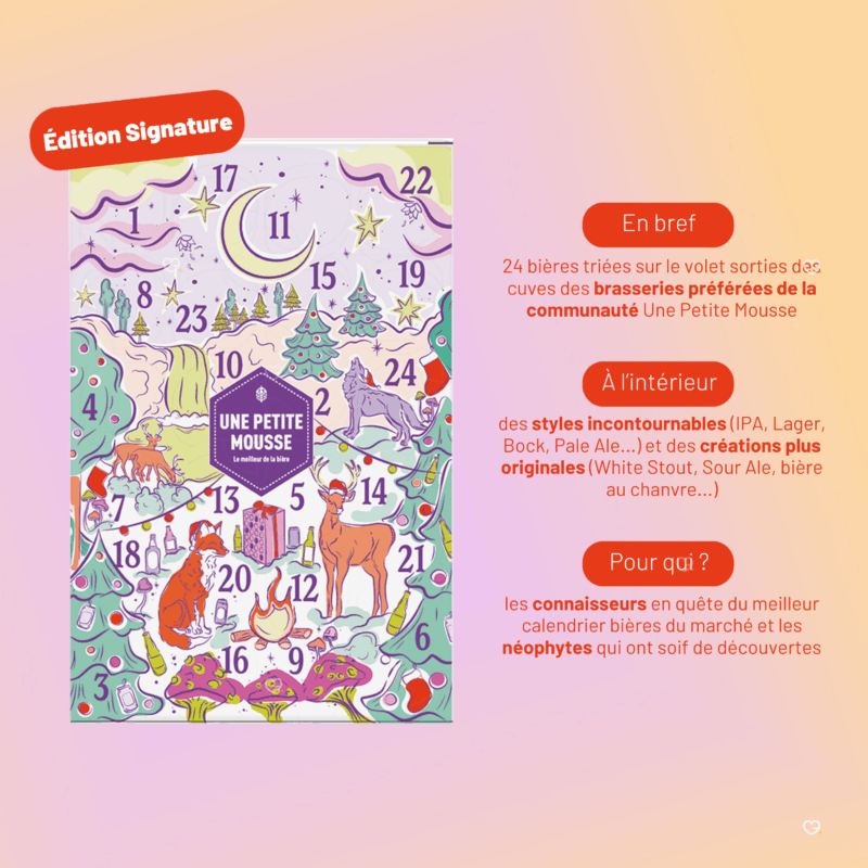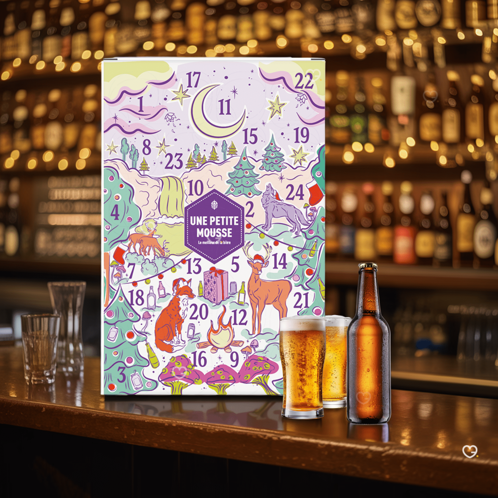 Partez à la découverte de 24 bières du monde et artisanales avec le calendrier de l'Avent Bières signé Une Petite Mousse. Savourez de tous plus de 15 styles différents ..IPA, Belges, Stouts, NEIPA et bien plus !