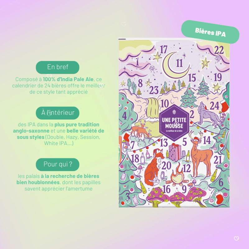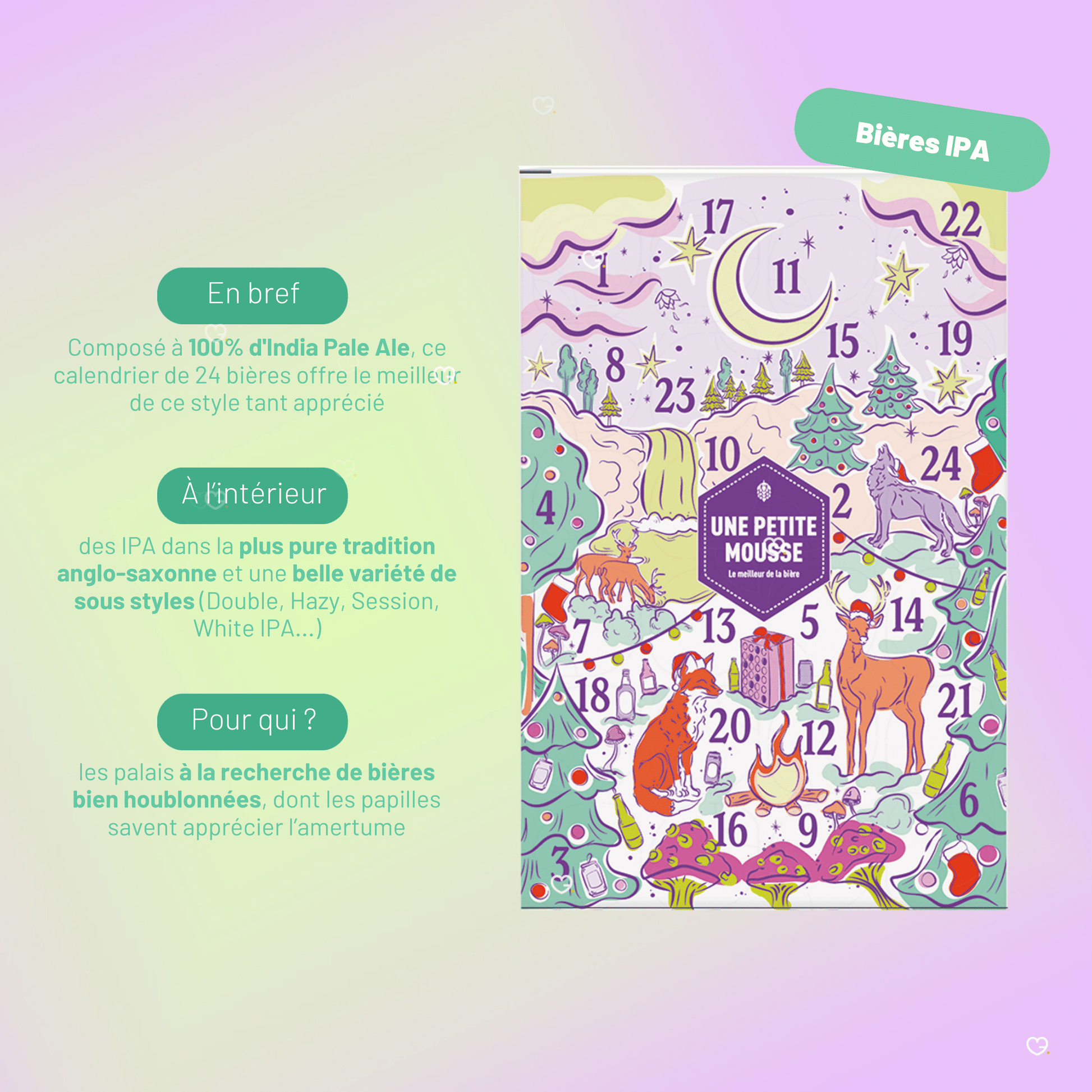 - Calendrier de l'Avent 100% bières IPA : 24 bières de style IPA : Double IPA, Hazy IPA, West Coast IPA, Session IPA ou encore White IPAs (69,95€)