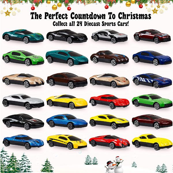 Ce calendrier contient 24 mini-voitures en métal, de modèles et couleurs variés.